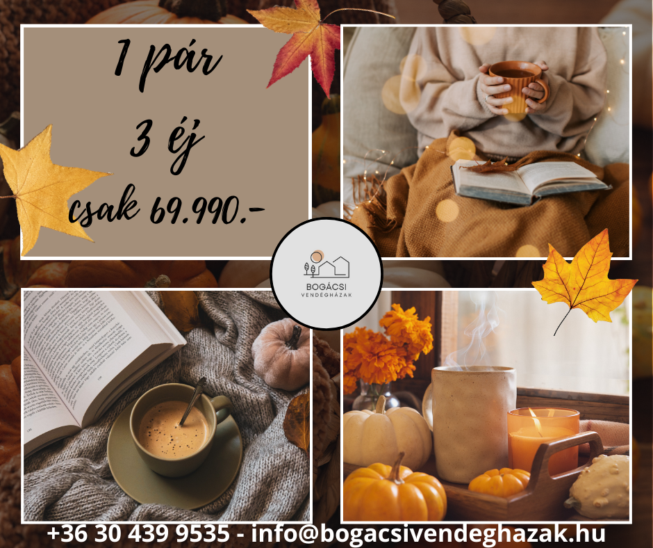 Fedezzék fel Bogács varázslatos világát egy olyan vendégházban, ahol csak Önök és a nyugalom létezik. A Romantikus Csomagunk tökéletes választás pároknak, akik meghitt kikapcsolódásra vágynak az őszi-téli hónapokban.